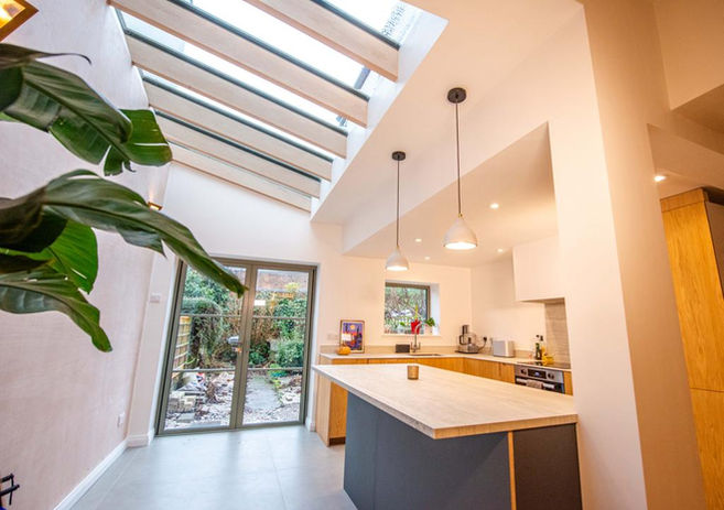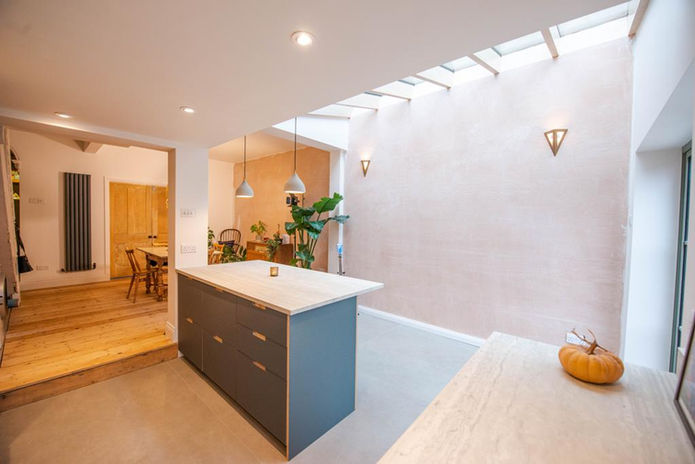 Extension to a victorian terrace featuring a glulam and glass roof.